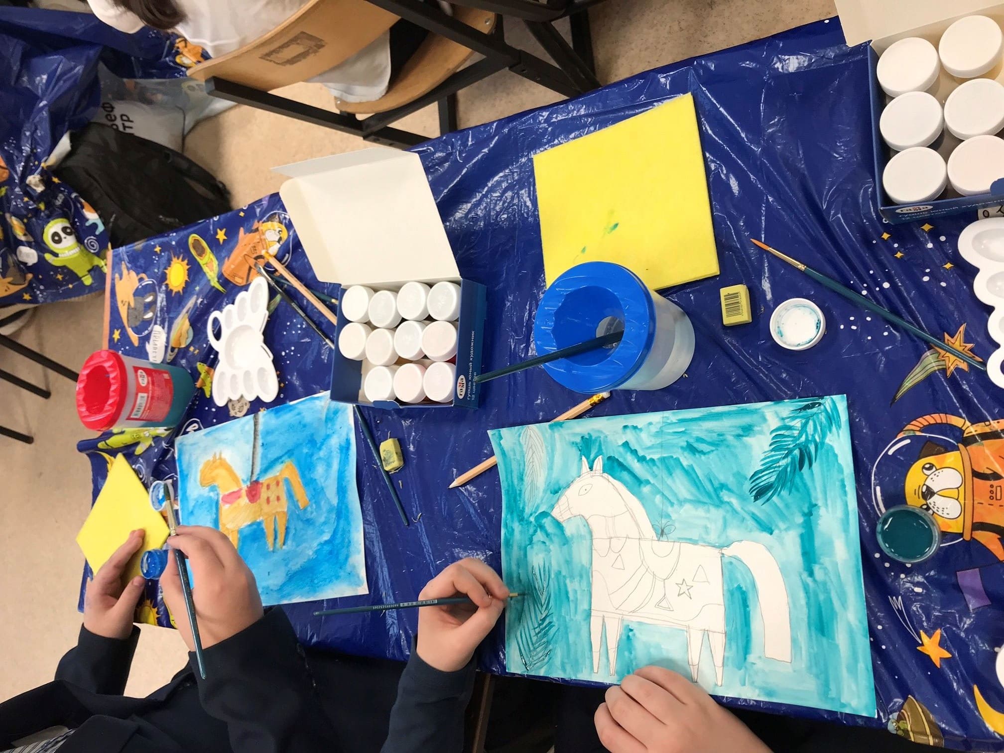 В ходе урока мы обсудили отличительные особенности наших будущих игрушек: яркую раскраску, детали - такие как седло и сбруя лошади, и простую, но выразительную форму. После предварительного эскиза дети приступили к работе с красками, используя насыщенные цвета и подбирая собственную цветовую гамму.
