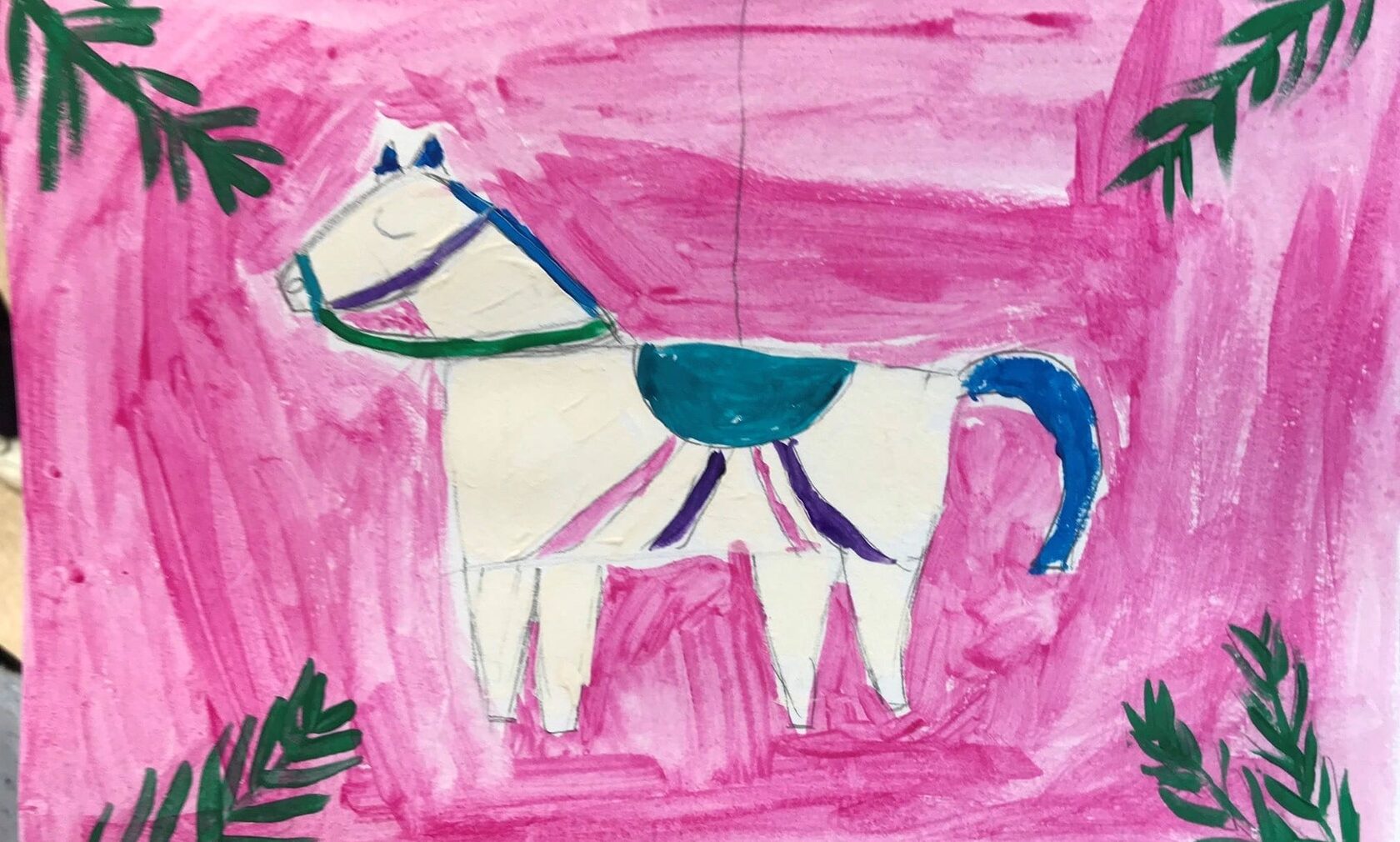 Завершили работу расставлением акцентов: еловых веточек и звёздочек вокруг игрушки. В результате каждый ученик изобразил уникальную красочную лошадку.