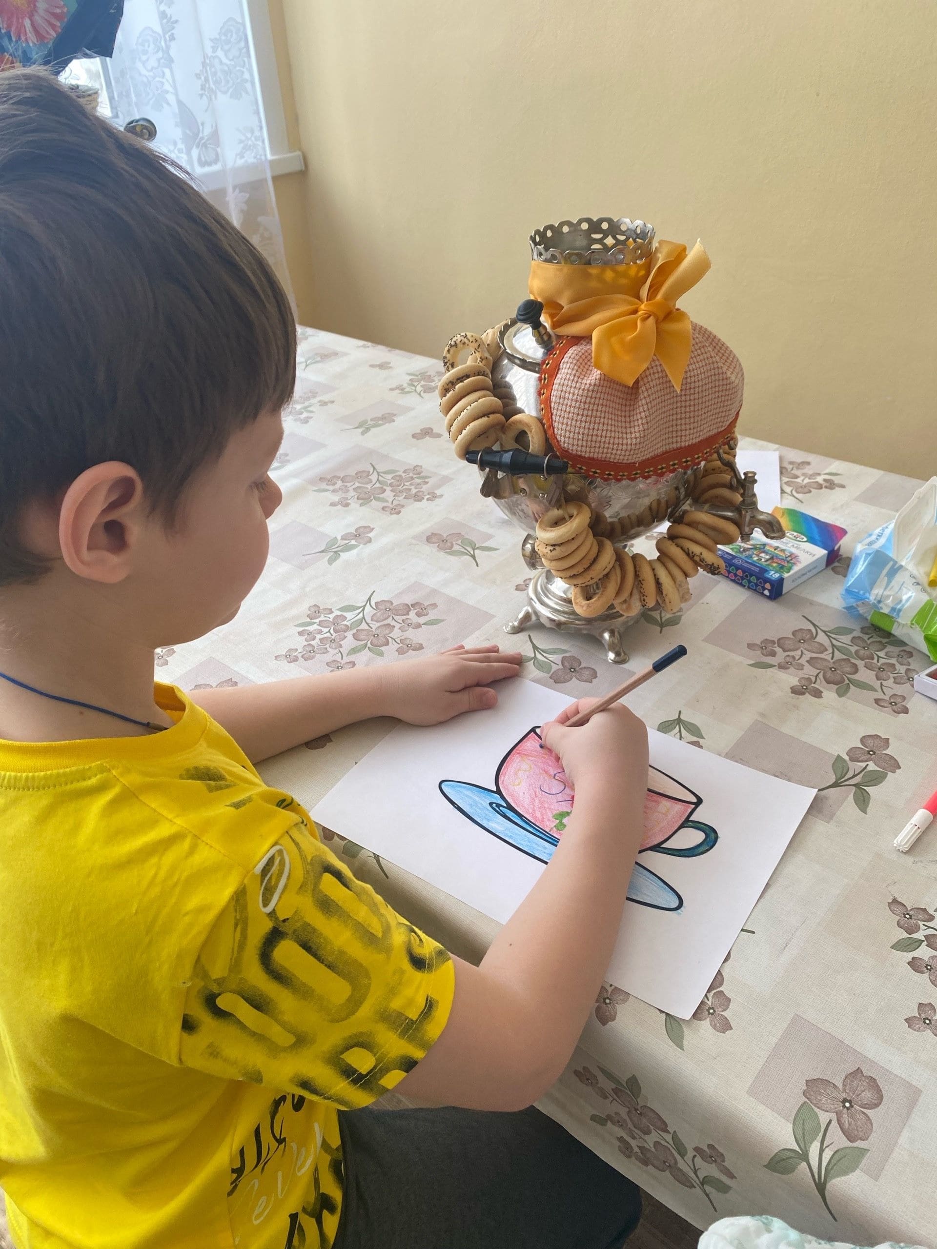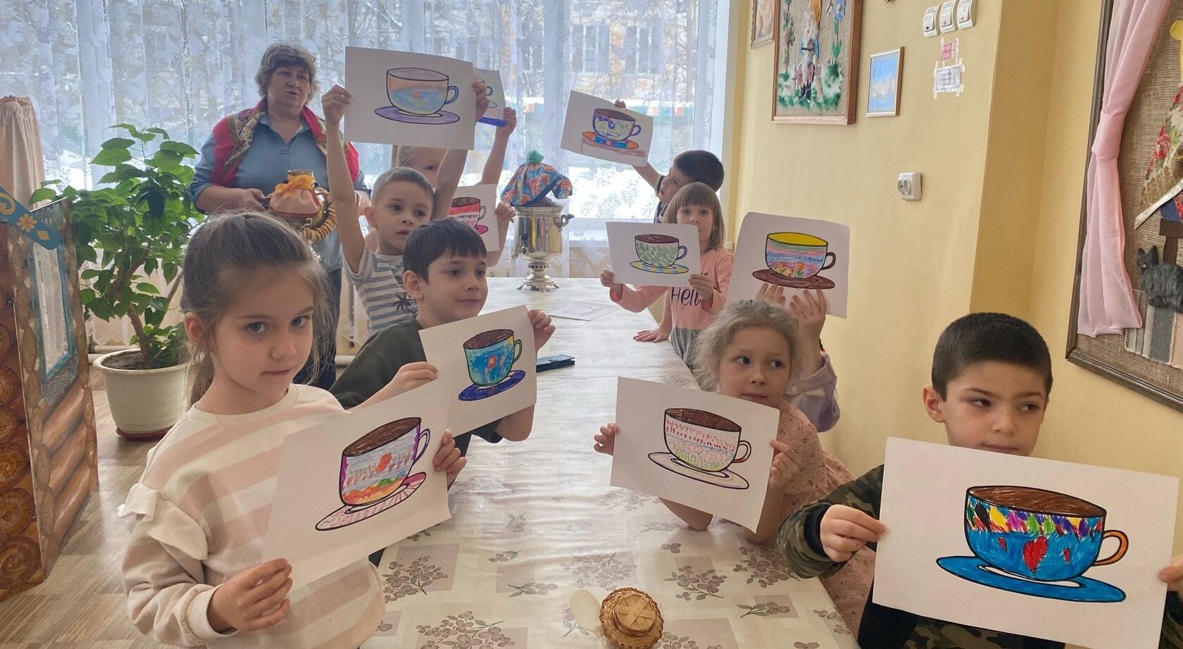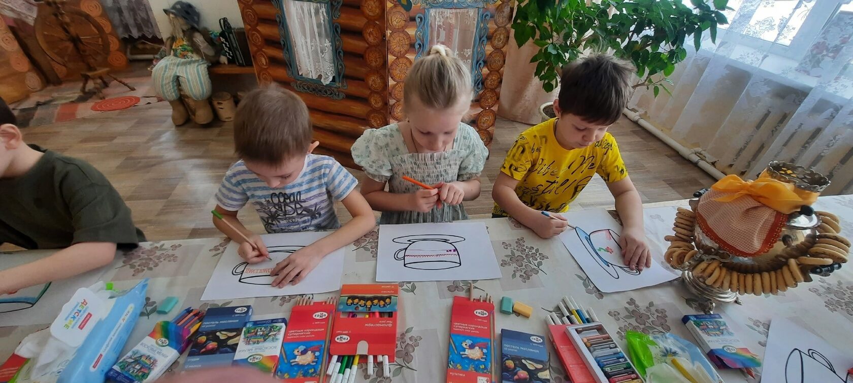 Маленькие художники вместе со старшим воспитателем Родиной Ольгой Адольфовной окунулись в атмосферу древней Руси, посетили мини-музей «Русская изба» в детском саду №12 «Родничок». Дети внимательно слушали рассказы о предметах повседневного быта наших предков — деревянной посуде, украшенных полотенцах, традиционной одежде и бытовой утвари. И на творческом этапе создали серию уникальных рисунков чайных пар, украсив их исходя из понимания того, для кого в семье они декорируют чашку, следуя собственным представлениям о красоте и гармонии.