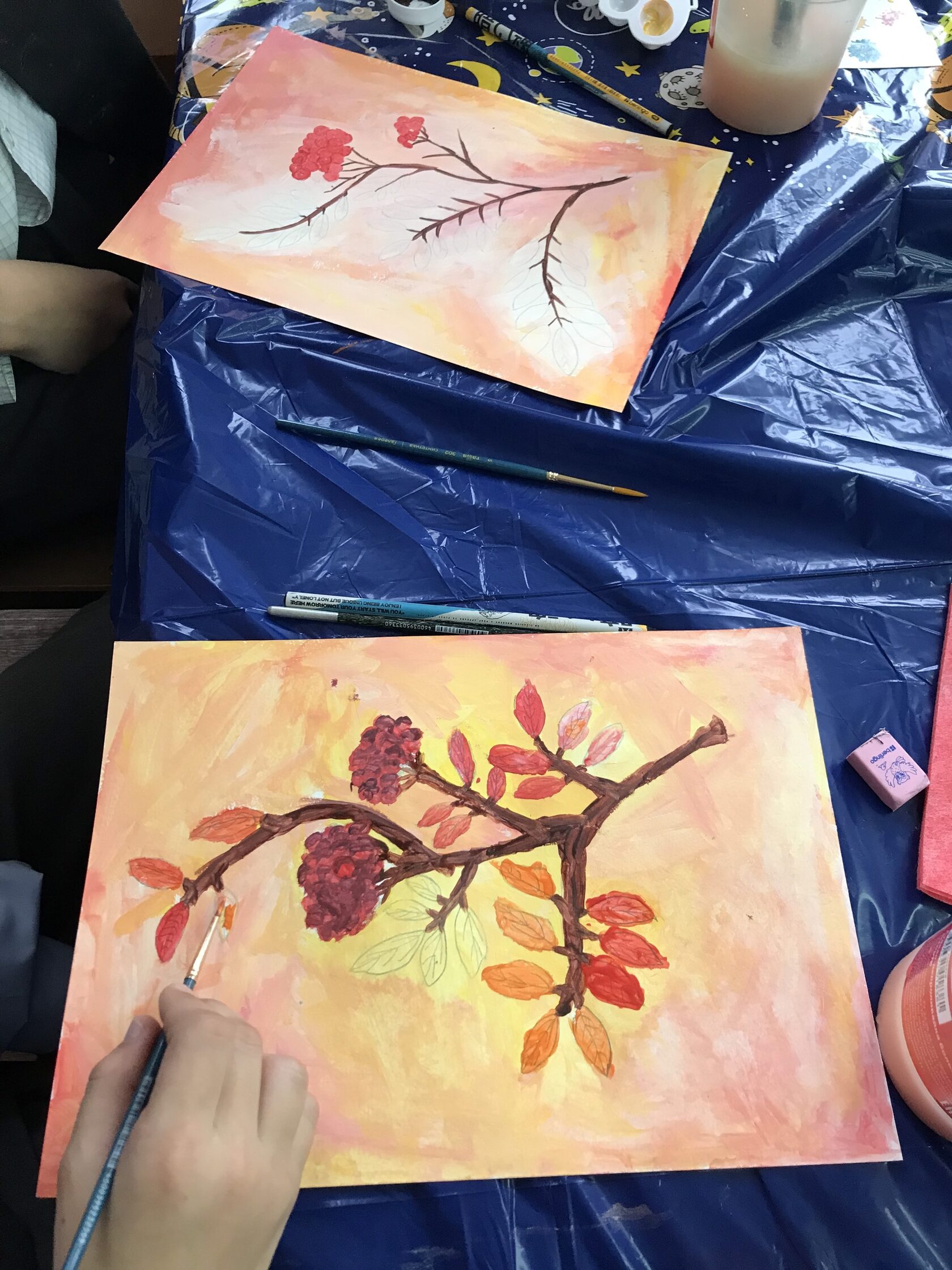 В процессе ребята вместе с педагогом обсуждали красивые осенние цвета и оттенки, учились передавать структуру листьев и веточек, а также развивали моторику и воображение, добавляя мелкие детали. Каждый художник смог выразить свою уникальную красоту осенней природы на бумаге, изобразив яркие гроздья и листья рябины.