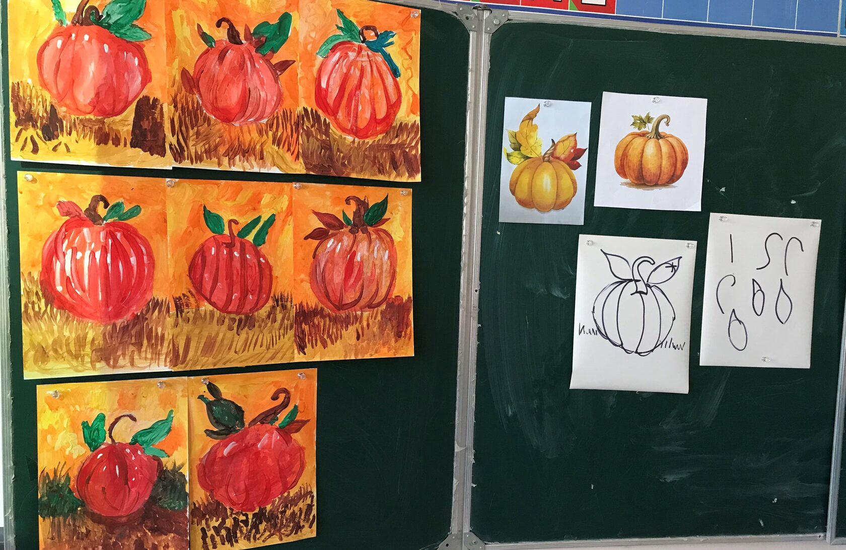 Ребята попробовали разные техники наложения красок и смешивания цветов. Рисунок начали с наметки самого главного - осенних тыкв. Продолжили уточнением деталей: листьев, веточек и прочего, а после перешли к краскам. Завершили работу яркими акцентами, а также изобразили траву и подчеркнули дольки у тыквы.