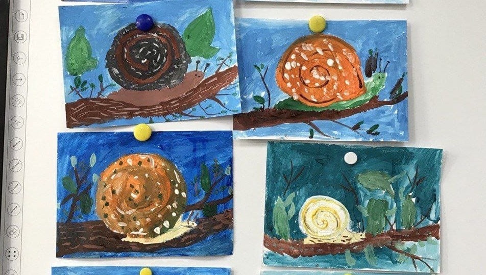 В своих работах дети придерживались ограниченной цветовой палитры, учились смешивать гуашь, создавая яркие и насыщенные оттенки для своих рисунков, использовать различные техники: от легких мазков до более плотного нанесения цвета. На завершающем этапе работы ребята добавили детали — завитки на раковинах улиток, блики, узоры, яркие листья и цветы вокруг.